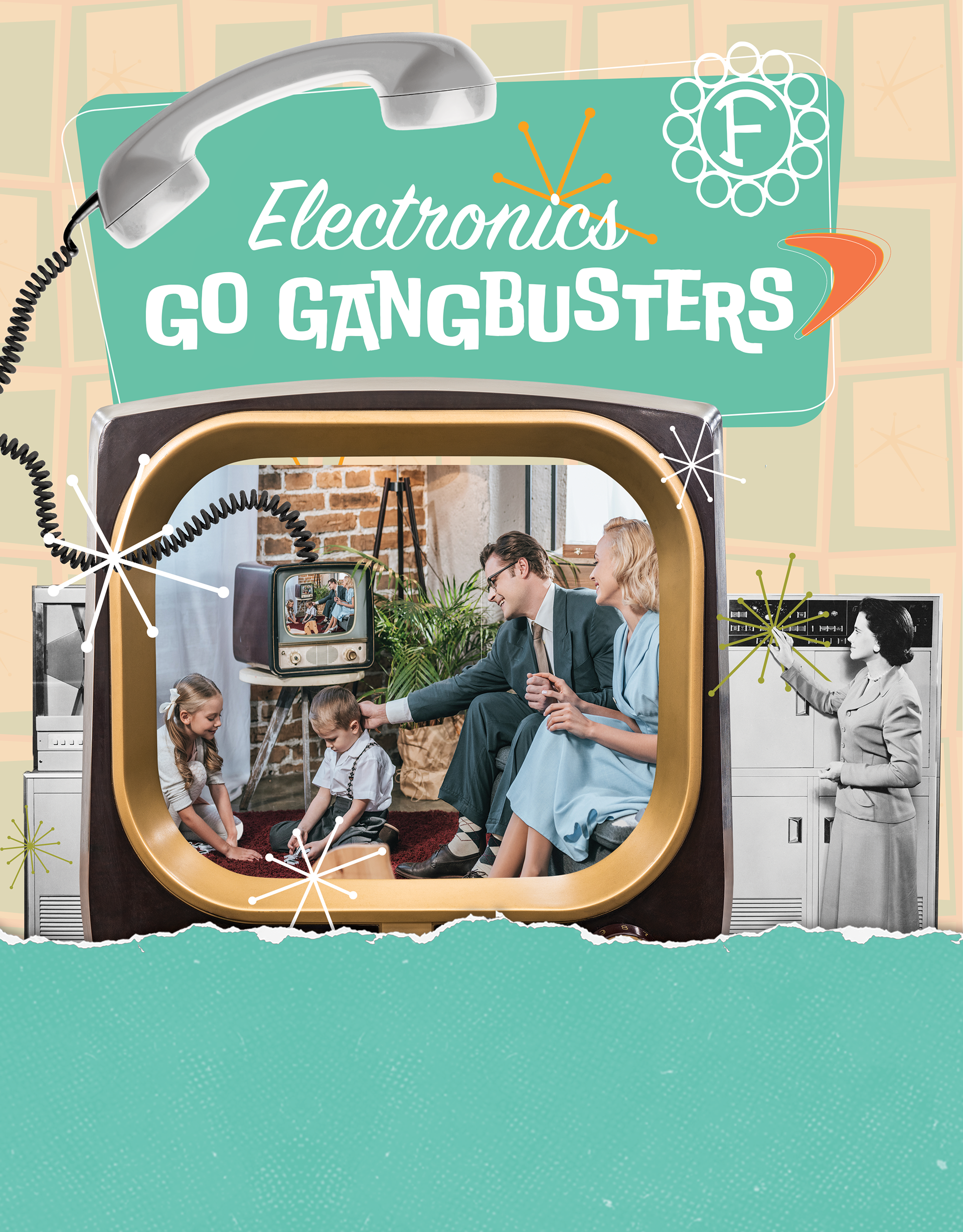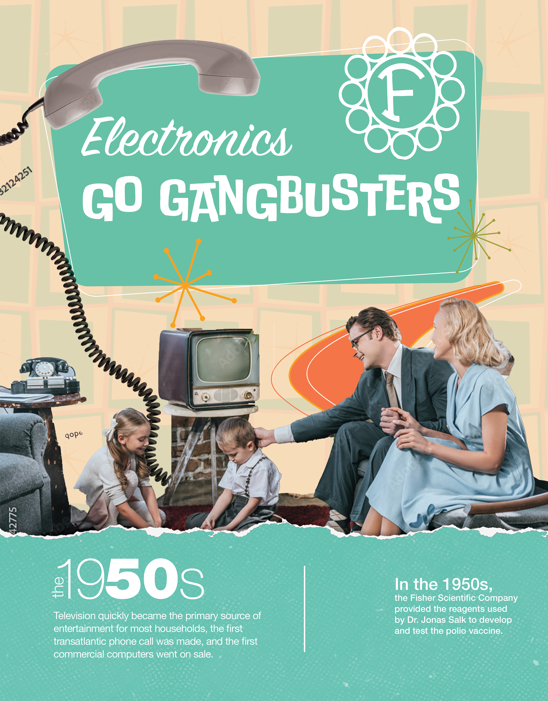 This design highlights the fun geometric shapes and colors of the middle of the century and centers around a family of that time period. In addition, it contains a Fisher Scientific logo from a 1954 Fisher catalog to show the evolution of the company.
