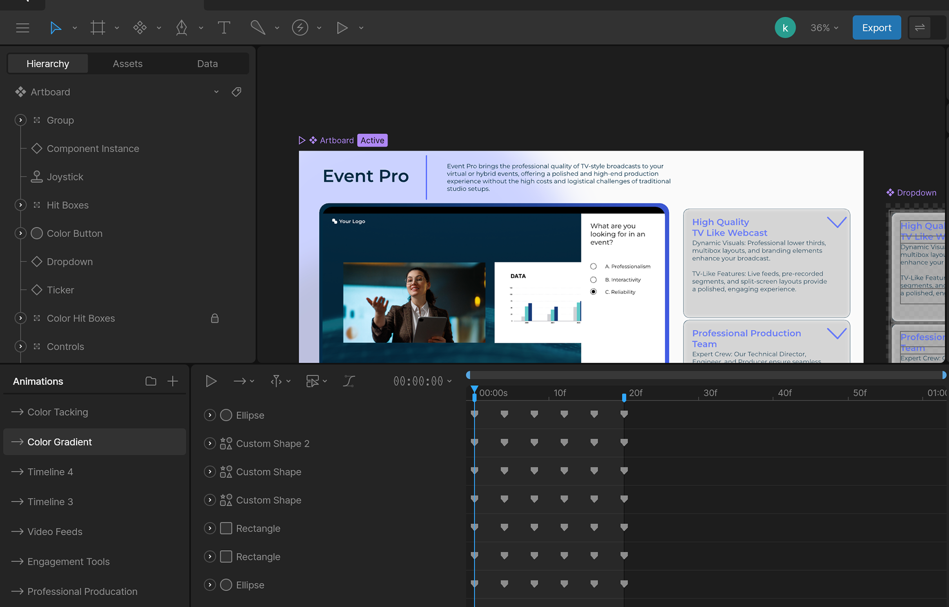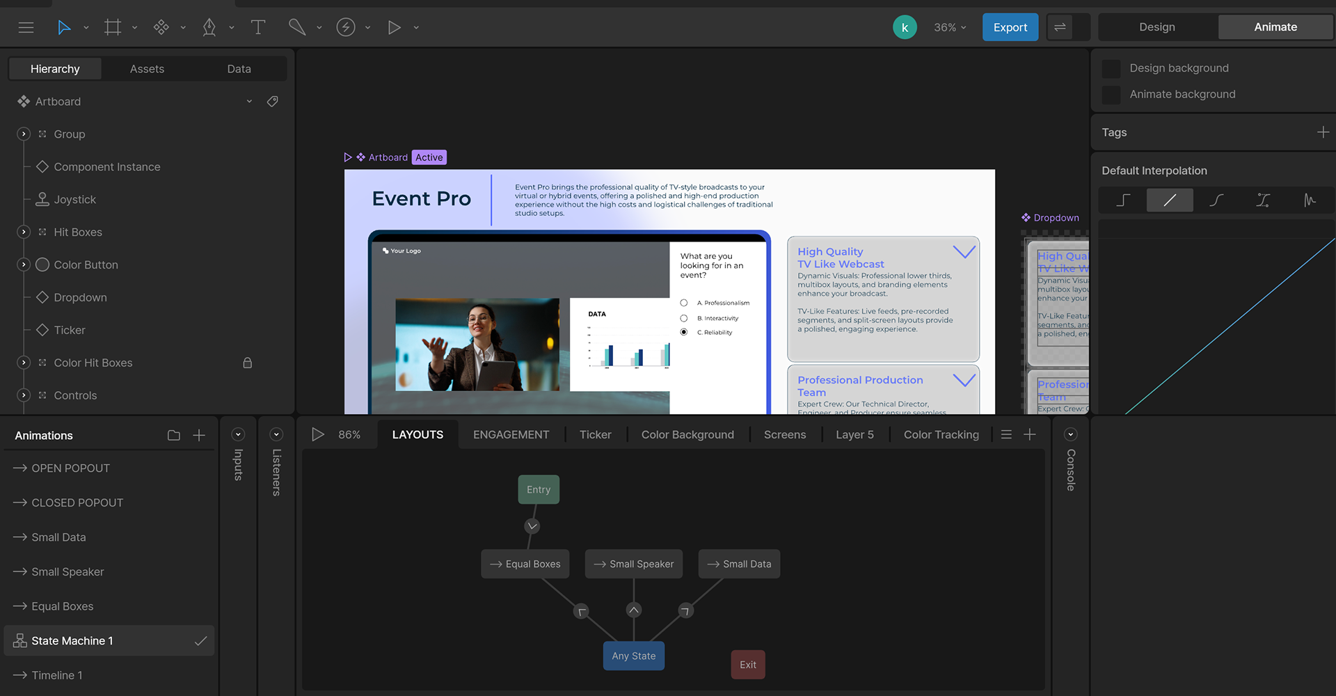 Using a series of interactive animation in Rive, I created a fully interactive demo for a platform. Typically, those interested in learning about the platform would book an hour meeting with producers who put on a small show to show off all of these features. This way, interested potential users can quickly get all the information they need while still having an interactive experience.